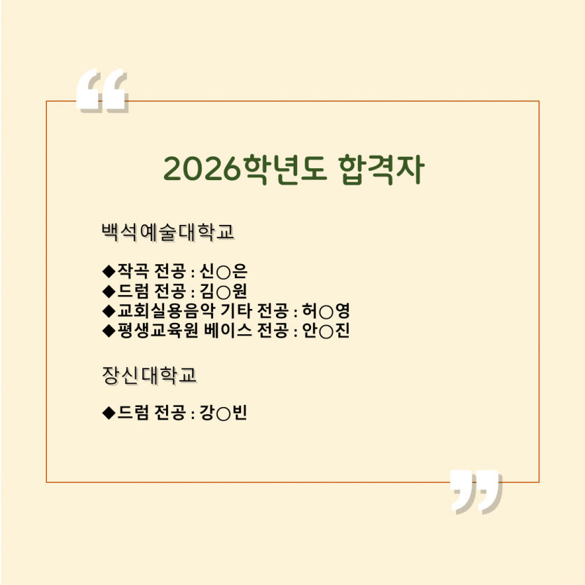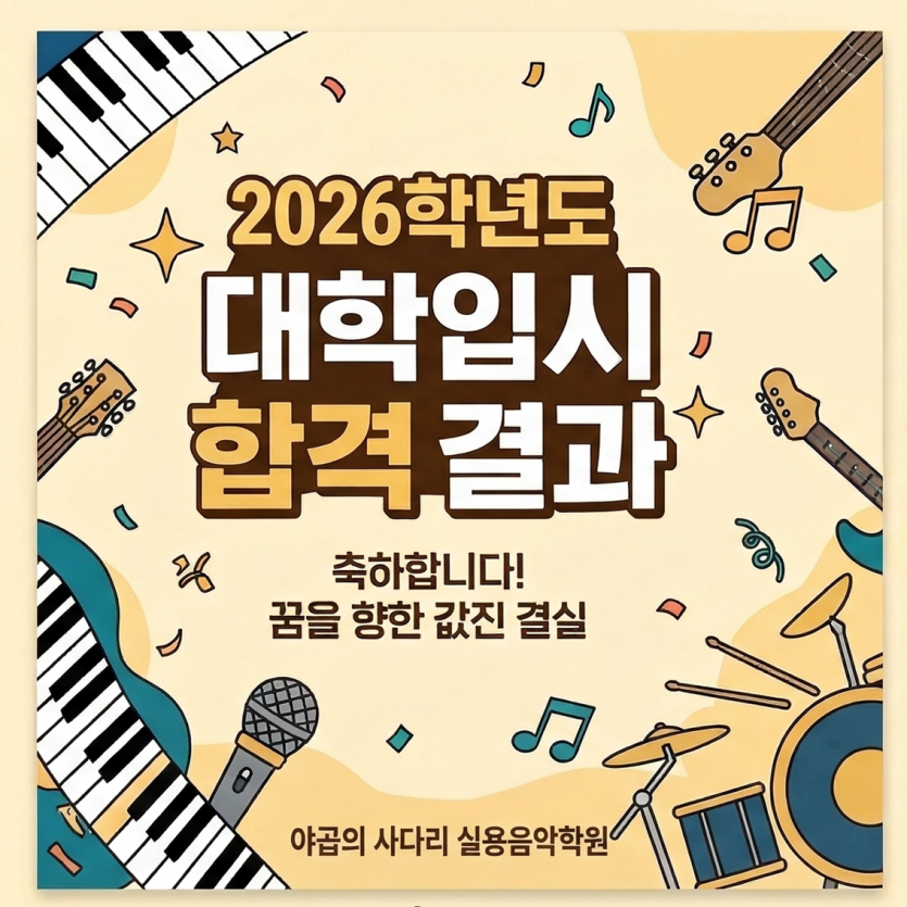 2026학년도 대학입시 합격을 축하드립니다. 페이지 정보 작성자 최고관리자 작성일26-03-09 17:52 조회46회 댓글0건 다음글 목록 본문 저희 학원은 개원이래 2026학년도까지 대학교수진의 전공지도하에, 대입 합격을 위해 최선을 다하고 있습니다. 2026학년도 합격하신 학생들 축하합니다. 올해는 역대 최대 경쟁률 속에서 학생들이 많이 힘들었던 입시였어요. 또 백석예술대학교 지원 희망 학생들이 많았네요. 댓글목록 등록된 댓글이 없습니다. 다음글 목록